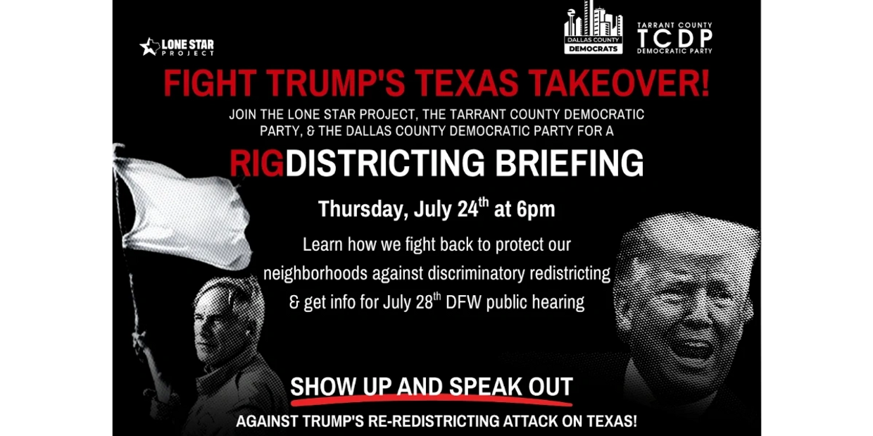 Please join the Lone Star Project, the Tarrant County Democratic Party, and the Dallas Democratic Party for a briefing TOMORROW AT 6 PM (THURSDAY, JUNE 24) about the statewide racial REdistricting efforts underway.